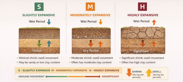 Soil expansivity classes S, M and H describe the degree of ground movement expected due to moisture changes.