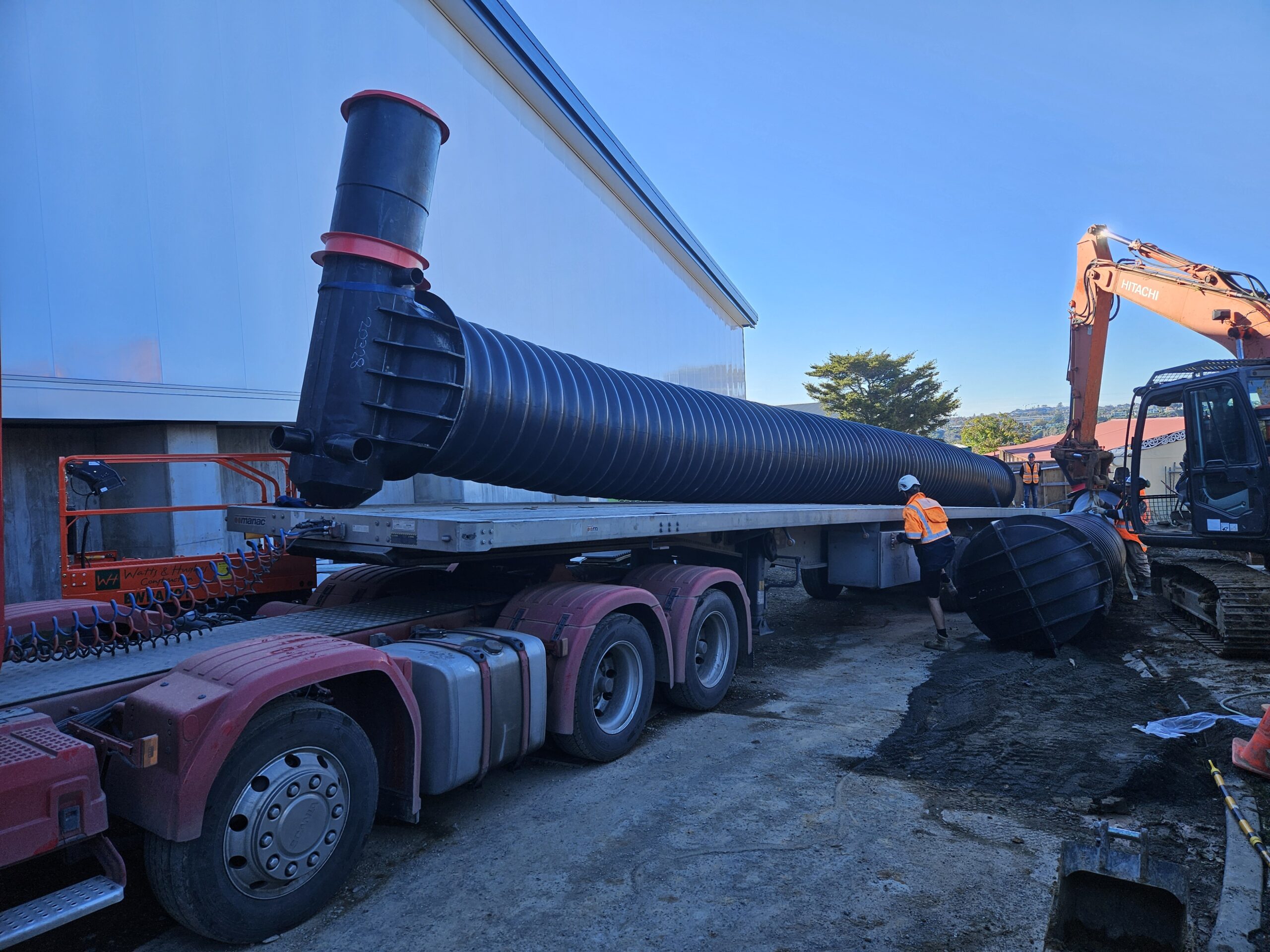 3 × 18,800 L StormLite® tanks (1,200 mm dia × 17 m long)